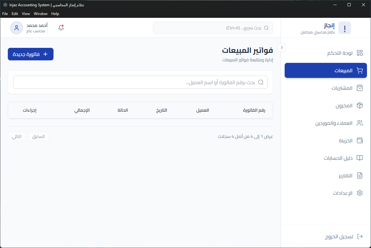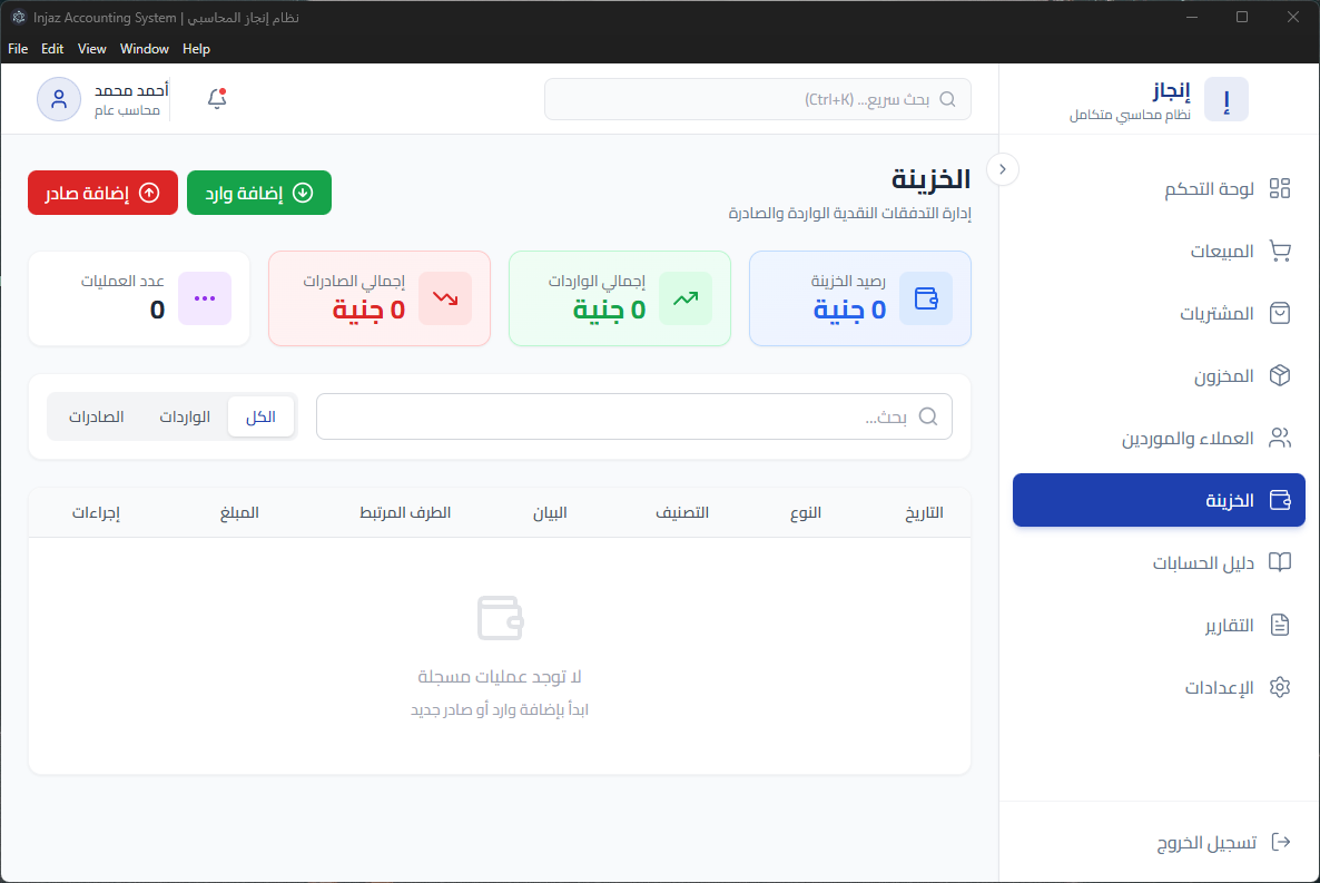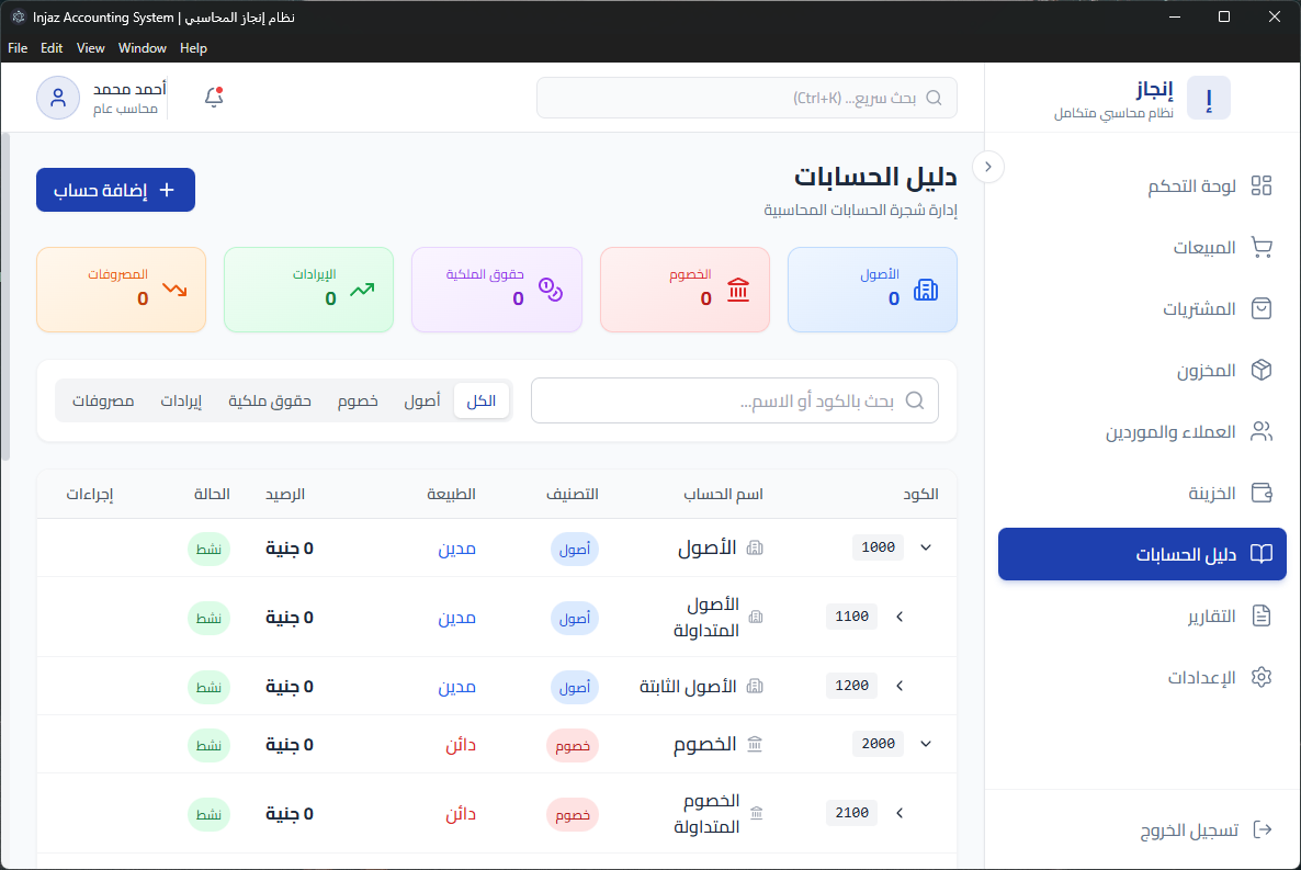 التطبيق به نظام مشتريات ومبيعات وخزينة وحسابات ختامية وعملاء وموردين